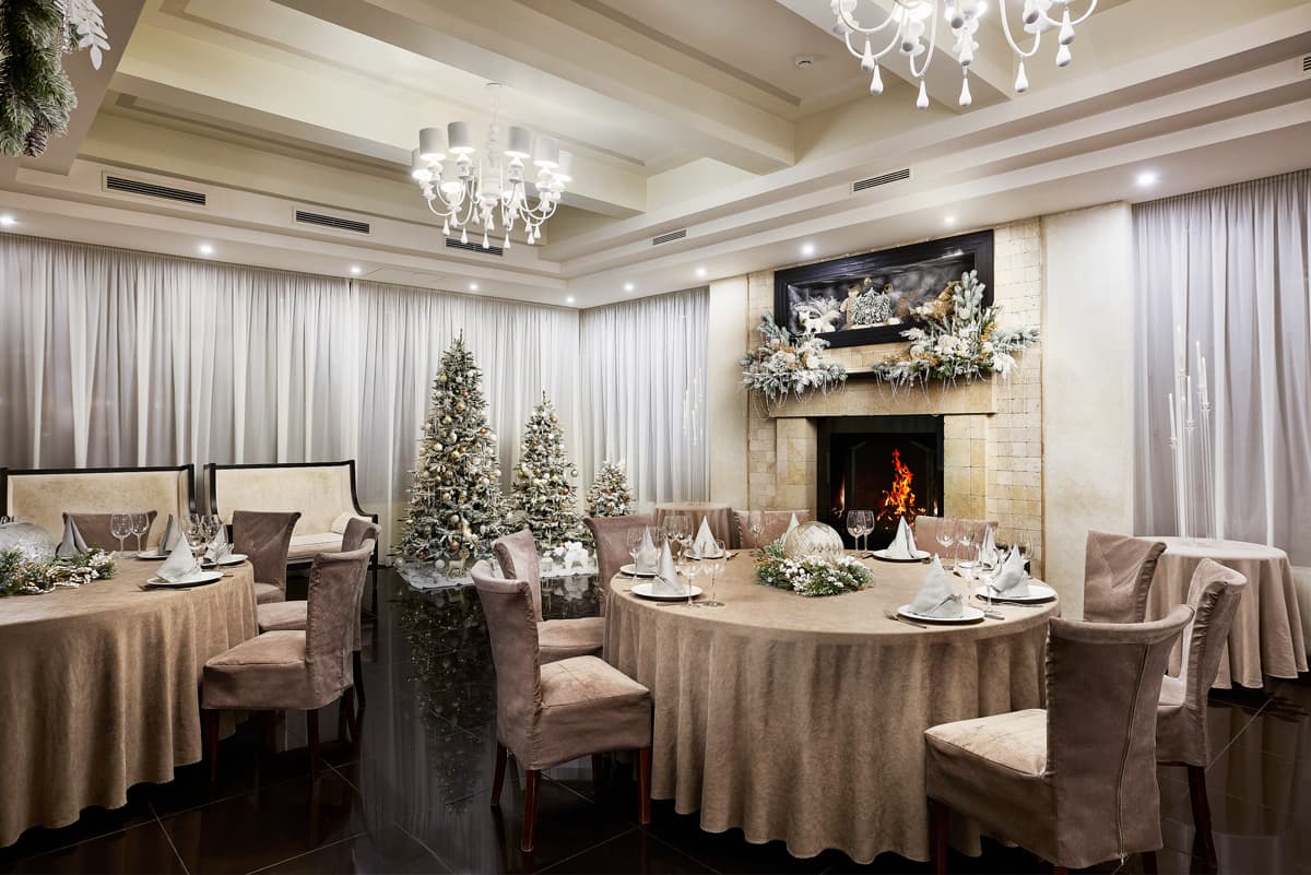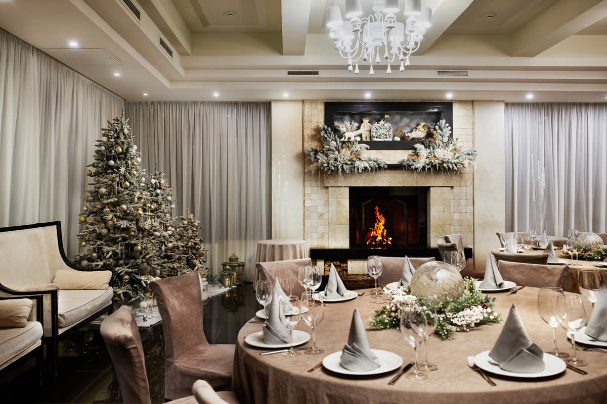 Элегантный банкетный зал с живым камином и панорамными окнами в сад. Место проведения семейного торжества или яркой корпоративной